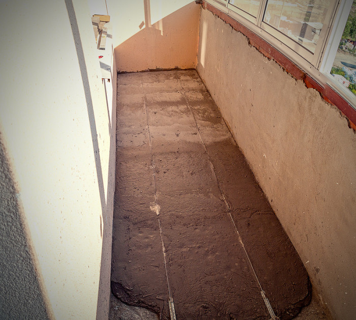 Когда стяжка готова, сверху кладётся плитка посредством специального клея. Песчано-цементная стяжка позволяет также обустраивать систему теплых полов. Вместо плитки можно пользоваться деревянными лагами — они монтируются продольно, после чего закрепляются монтажной пеной. Сверху накладывается сплошной настил из шпунтовых досок.
