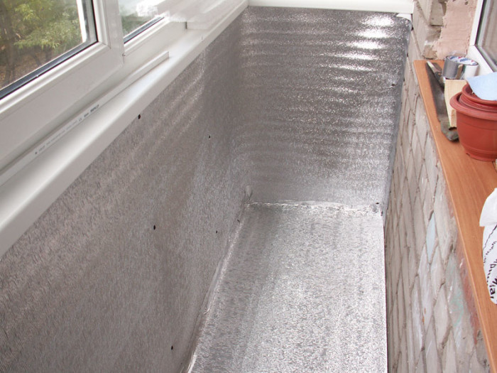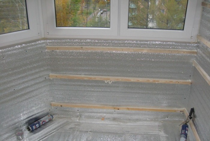 Вначале убирается старая отделка. Затем углы и щели заклеиваются лентой, обеспечивающей герметичность. Далее устанавливаются вертикальные лаги, на которые прикрепляется пенофол. Сторона с фольгой должна «смотреть» наружу.