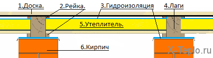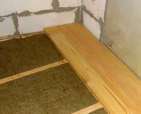 Деревянные лаги устанавливаются на фундамент с шагом 0,5–1 м или врубаются в сруб. Далее настилается «черновой» пол. Свободное пространство заполняется теплоизоляцией. Достаточно простой и эффективный способ.