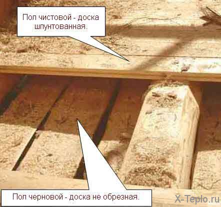 Нижний слой из неотёсанных досок тщательно крепится непосредственно к балкам. На «черновую» конструкцию укладывается «чистовое» покрытие.
