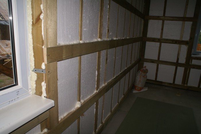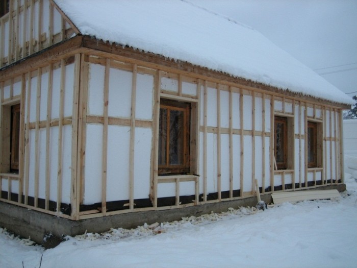 Монтаж теплоизоляции своими руками выполняется в таком порядке. Сначала производится обустройство пароизоляции — она предотвратит попадание в утеплитель влаги из комнаты. Каркас внутри дома обшивается ДСП плитами, состыковку необходимо вести по стойкам. В образовавшиеся ниши закладывается утеплитель в два слоя — изделия имеют ширину 60 см, что соответствует проему между стойками.