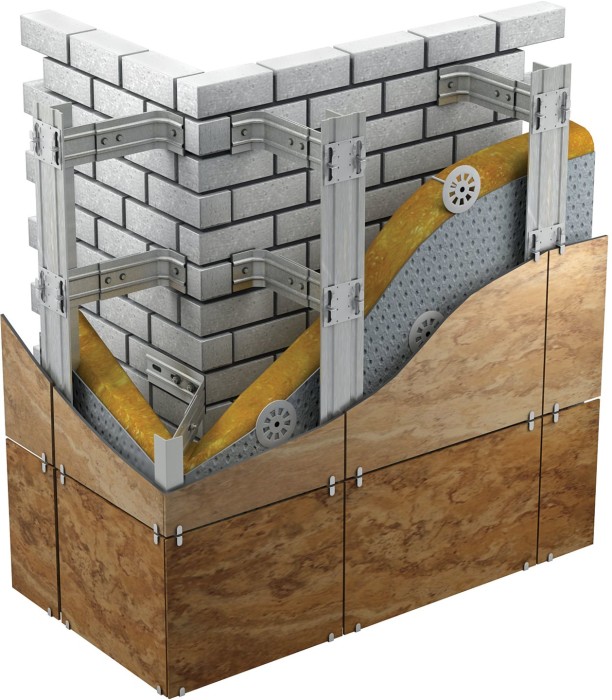 Вентилируемые фасады монтируют с наружной стороны дома. Система состоит из нескольких конструкций, сочетание которых обеспечивает максимальную защиту здания от потери тепла. Последовательность операций по установке: