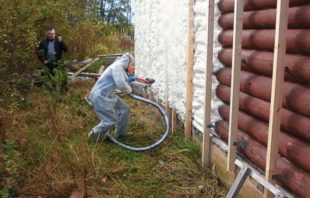 В первом случае монтаж утеплителя производится с образованием некоторого зазора между стеной и материалом. В итоге точка росы сдвигается вне стены, а те, в свою очередь, получают дополнительную защиту от звуков. Кроме того, брус не будет гнить, что тоже важно. Приемлем и вариант с пенополиуретаном. В этом случае его распыляют на поверхность. Он обладает отличным вспениванием и создает превосходную теплоизоляцию.