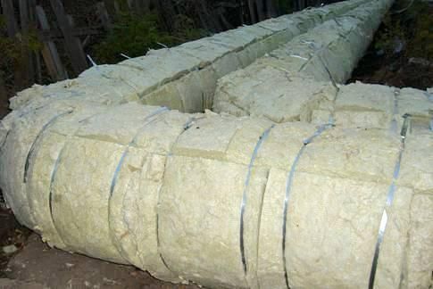 Материал легко монтируется и равномерно прилегает к трубе. Стоит он дороже, чем стекловата, но тоже нуждается в защите. В качестве защитного слоя на рулоны клеится рубероид, пергамин или фольгоизол.