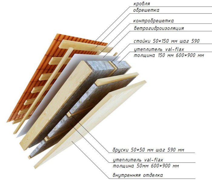 - если используется минвата, то сначала между стропилами прямо под черепицу устанавливается утеплитель, а следующий слой монтируют с внутренней стороны между контррейками.
