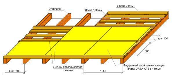 Утепление крыши пенопластом поверх закрытых стропильных изделий мало чем отличается от теплоизоляции поверх открытых стропил. Разница кроется в обрешётке утеплительной прослойки. Она устанавливается под стропильной системой. Обшивку выполняют из деревянных досок, вагонки, пластика или гипсокартона.