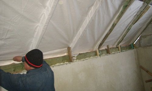 Далее производят укладку пароизоляционного слоя. Это может быть фольгированный материал, который дополнительно обладает теплоотражающими свойствами, либо специальные перфорированные плёнки, либо мембраны. Пароизоляцию крепят при помощи мебельного степлера. При этом материал не нужно сильно натягивать, он должен слегка провисать. Швы заклеиваются специальной лентой.