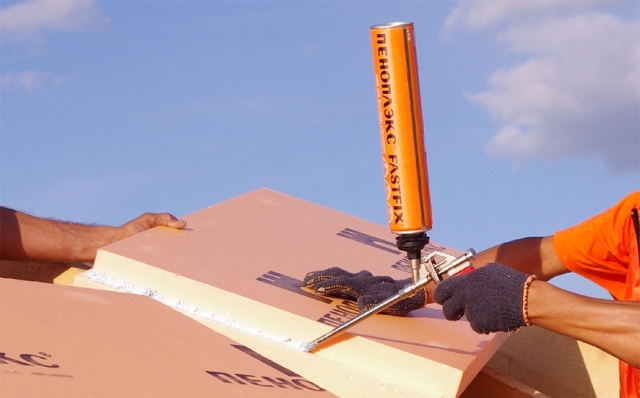 Компания Пеноплекс рекомендует для фиксации теплоизоляционных плит использовать специально изготовленный для этого клей Пеноплэкс FASTFIX. Он продается в баллончике объемом 750 мл.