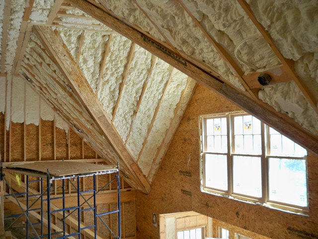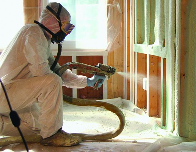 Утепление дома можно выполнить как изнутри, так и снаружи. Обычно ППУ наносится на фасад и на крышу. Для выполнения работ необходимо иметь оборудование для смешивания и распыления составов, состоящих из нескольких компонентов. После нанесения получится ровный слой желтоватого оттенка. Если заизолирована наружная поверхность дома, то ее можно обшить любыми панелями или покрасить. Утепление фасада начинается с изготовления обрешетки для финишной отделки. Изоляционный материал не боится плесени, не подвергается порче грызунами и не гниет.