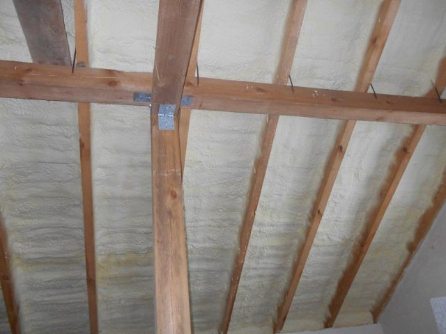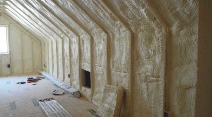 Утепление помещений начинается с монтажа обрешетки. Стоит заметить, что она будет нужна не для улучшения качества покрытия ППУ, а для облицовки стен после их утепления отделочными материалами. Надо сказать, что пенополиуретан должен быть защищен от ультрафиолетовых лучей. Кстати, это является единственным его недостатком. Наносится он прямо на стены и потолок в несколько слоев. При этом каждый предыдущий слой должен высохнуть в течение 20 секунд. Полное отвердение пены происходит в течение часа.