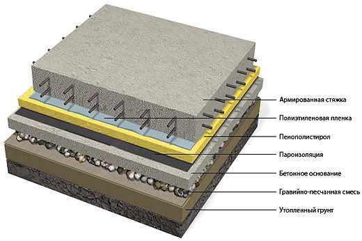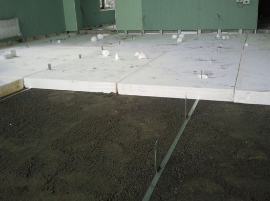 Уложенные листы утеплителя покрывают гидроизоляционной пленкой, поверх которой укладывают сетку и делают стяжку. Ненадежность, хрупкость такого пола обманчивы, он способен выдержать несколько тонн усилия на один квадратный сантиметр. Толщина стяжки должна быть не менее 60 мм. В заключение производится чистовая обработка поверхности пола, если необходимо — укладка дополнительных материалов.
