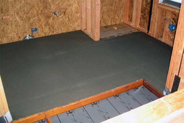 Изолировать бетонный пол можно и другим способом. Для этого в цементно-песчаную смесь добавляют кусочки пенопласта. Отдельная укладка плит уже не требуется. Стяжка выполняется прямо поверх бетонного основания. Гидроизоляцию устанавливают после того, как стяжка окончательно застынет, а это не раньше чем через 20–30 дней. Сверху укладывают напольное покрытие: линолеум, ламинат, плитку и т. д.