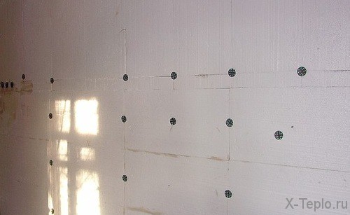 Следует уточнить, что, если при термоизоляции помещения изнутри можно обойтись только креплением пенопласта с помощью клея Ceresit, то при внешнем утеплении необходимо еще закреплять материал дюбелями или шурупами. Схема крепления такая – один дюбель вбиваем по центру, а остальные четыре по углам соответственно. Этот процесс требует большой точности и аккуратности, не стоит прикладывать чрезмерные усилия при закреплении листов к стене, так как могут возникнуть трещины или сколы пенопласта.